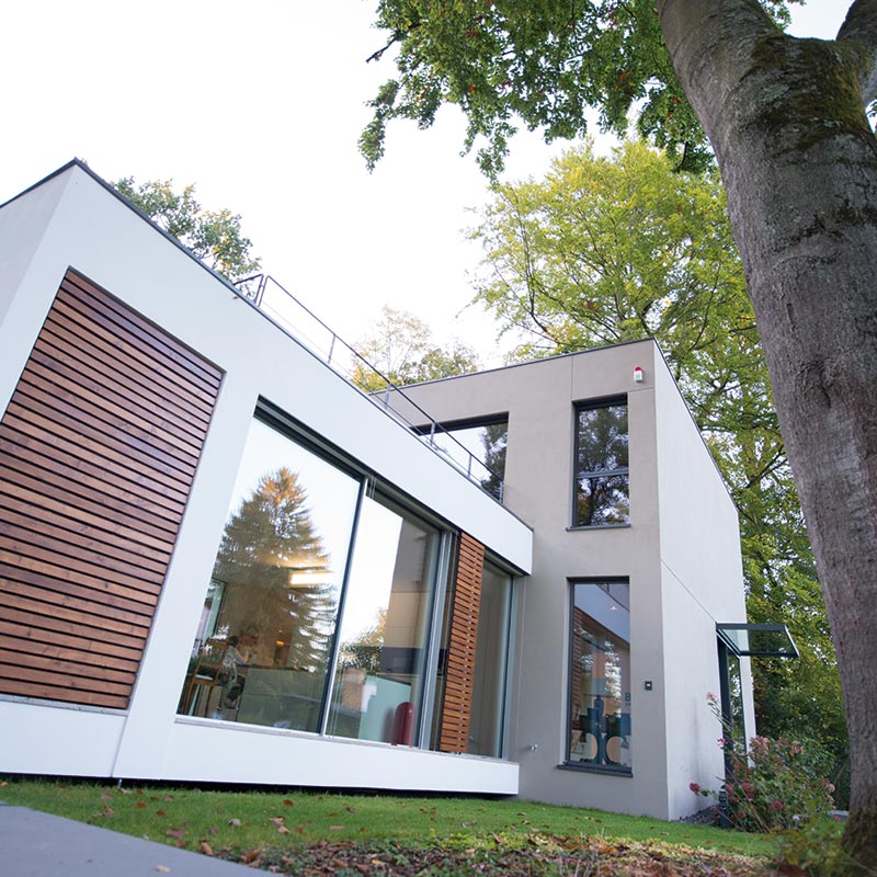 I 2016, i udkanten af Frankfurt – på et parklignende stykke jord omgivet af gamle bøgetræer – byggede en ung familie deres drømmehus i en moderne stil. Køkkenet med spiseplads i åben plan er husets kommunikative hjerte. Tilgængelig fra to sider, køkkenet og spisepladsen kan åbnes op til eller adskilles fra stuen med skydedøre.