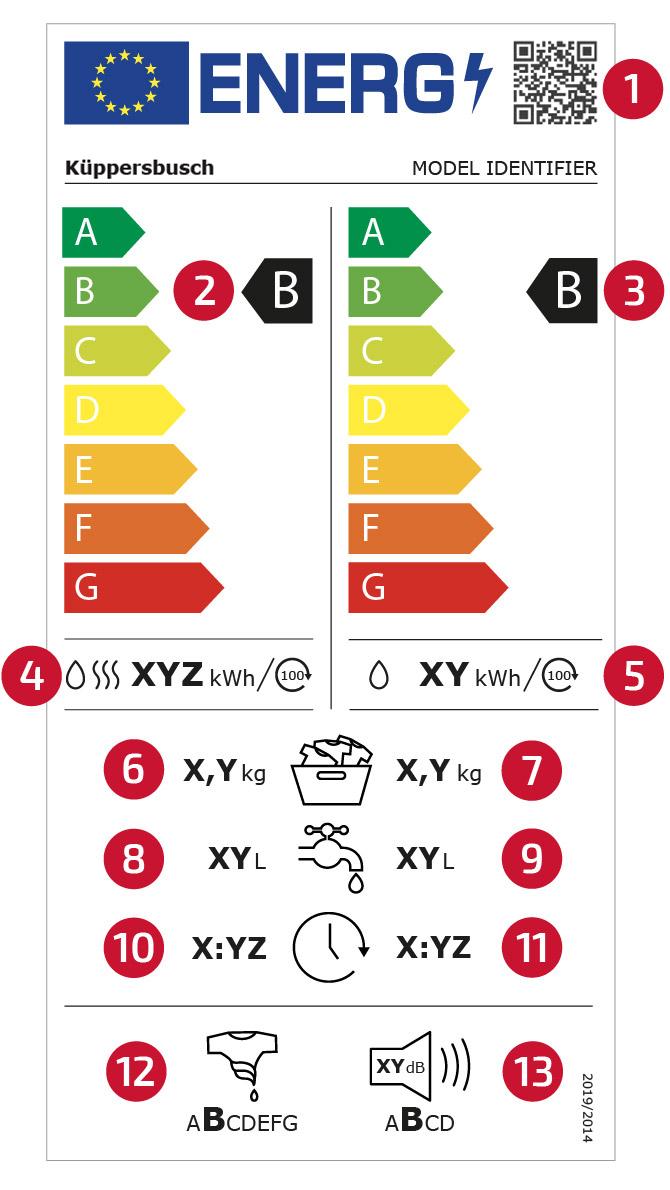 Στη νέα ενεργειακή ετικέτα, το εύρος κλίμακας από το Α έως το G θα παραμείνει. Ωστόσο, η ετικέτα θα χωριστεί σε δύο στήλες. Στα αριστερά, οι τιμές για την πλήρη λειτουργία, που σημαίνει πλύσιμο και στέγνωμα. Και στη δεξιά στήλη, μόνο για πλύσιμο.