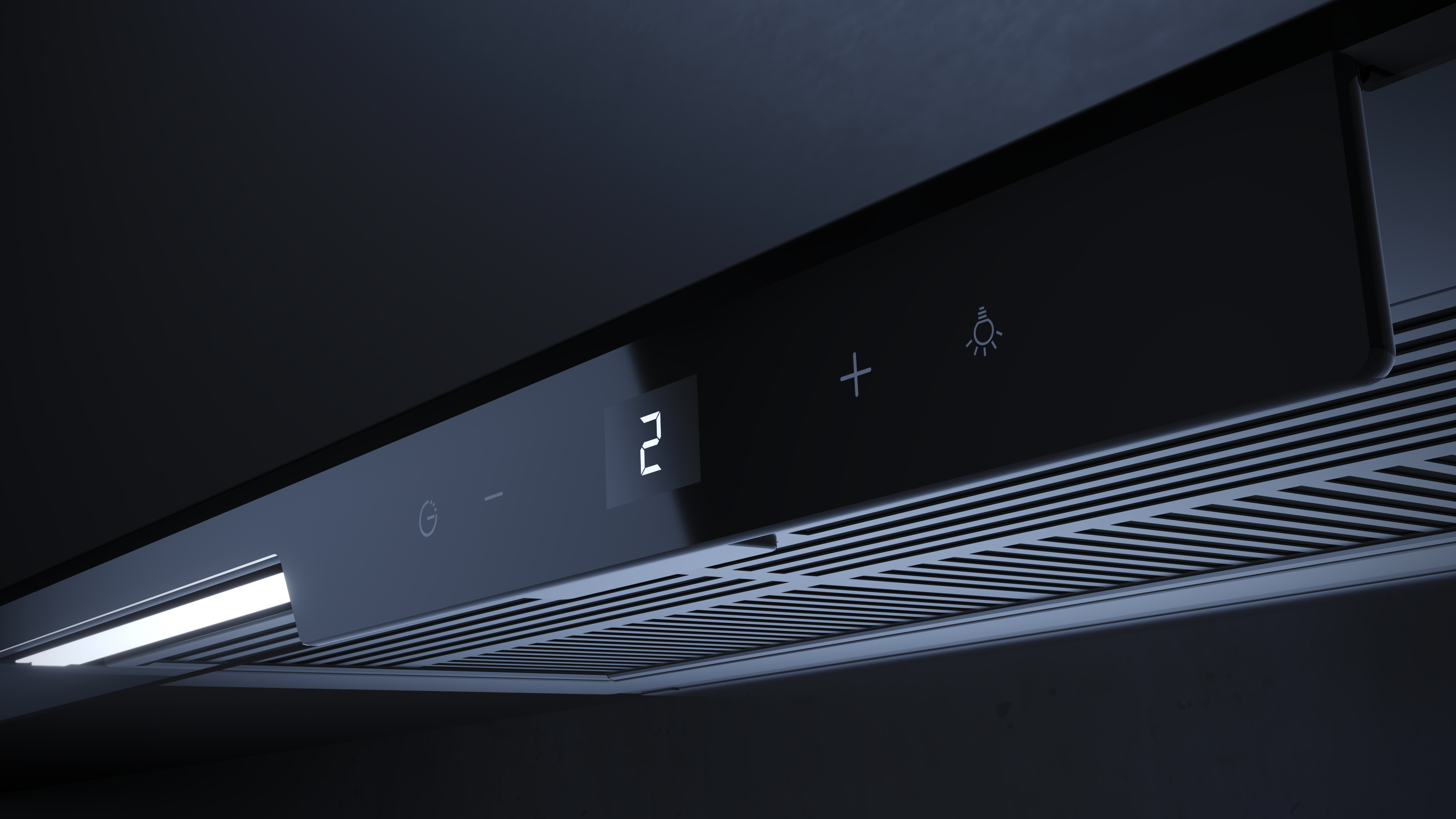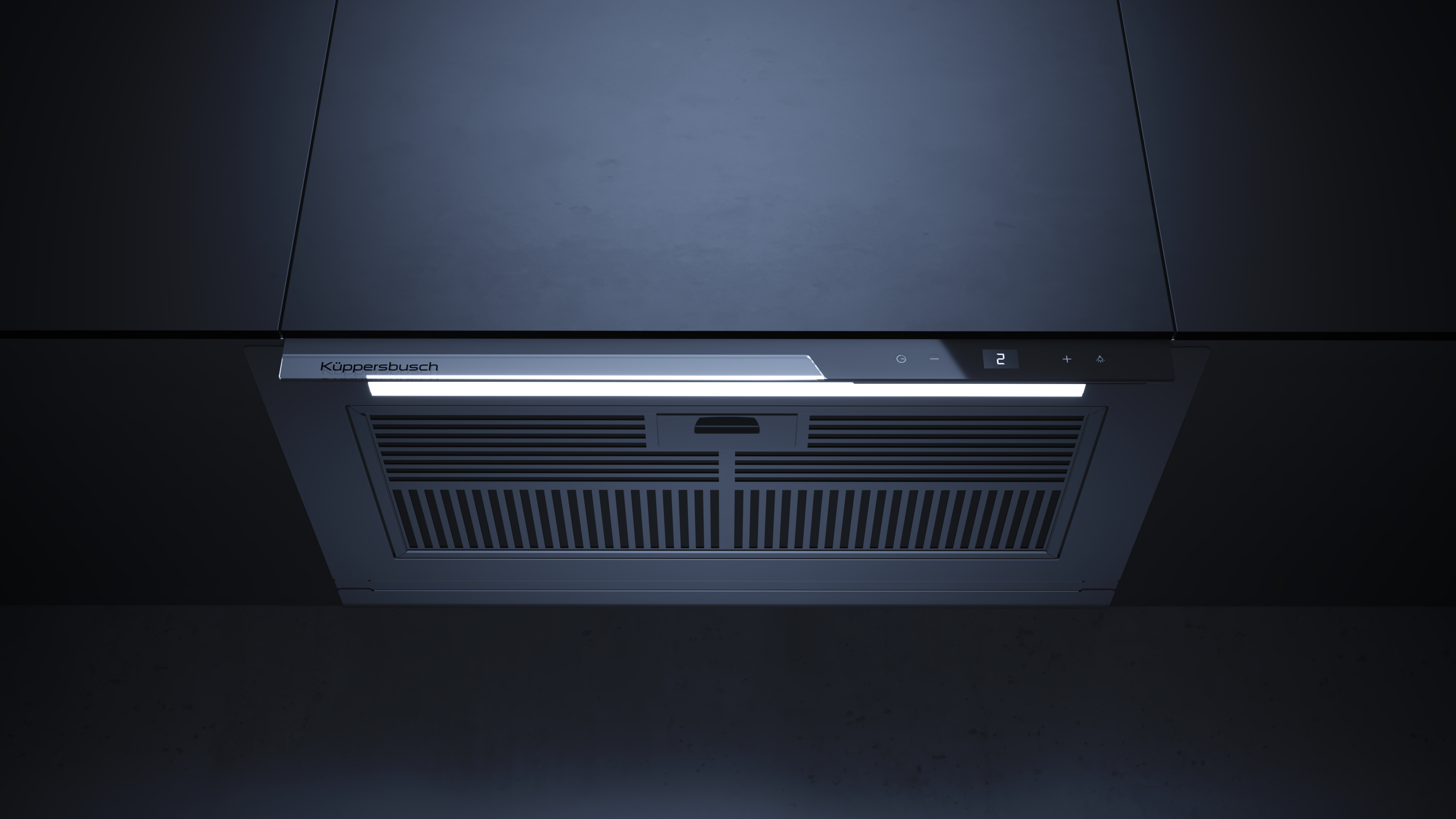 De afzuigkap sluit naadloos aan op het werkblad en voegt zich discreet in het keukenontwerp. Het slanke lijnenspel staat garant voor topprestaties zonder het visuele totaalbeeld te verstoren.